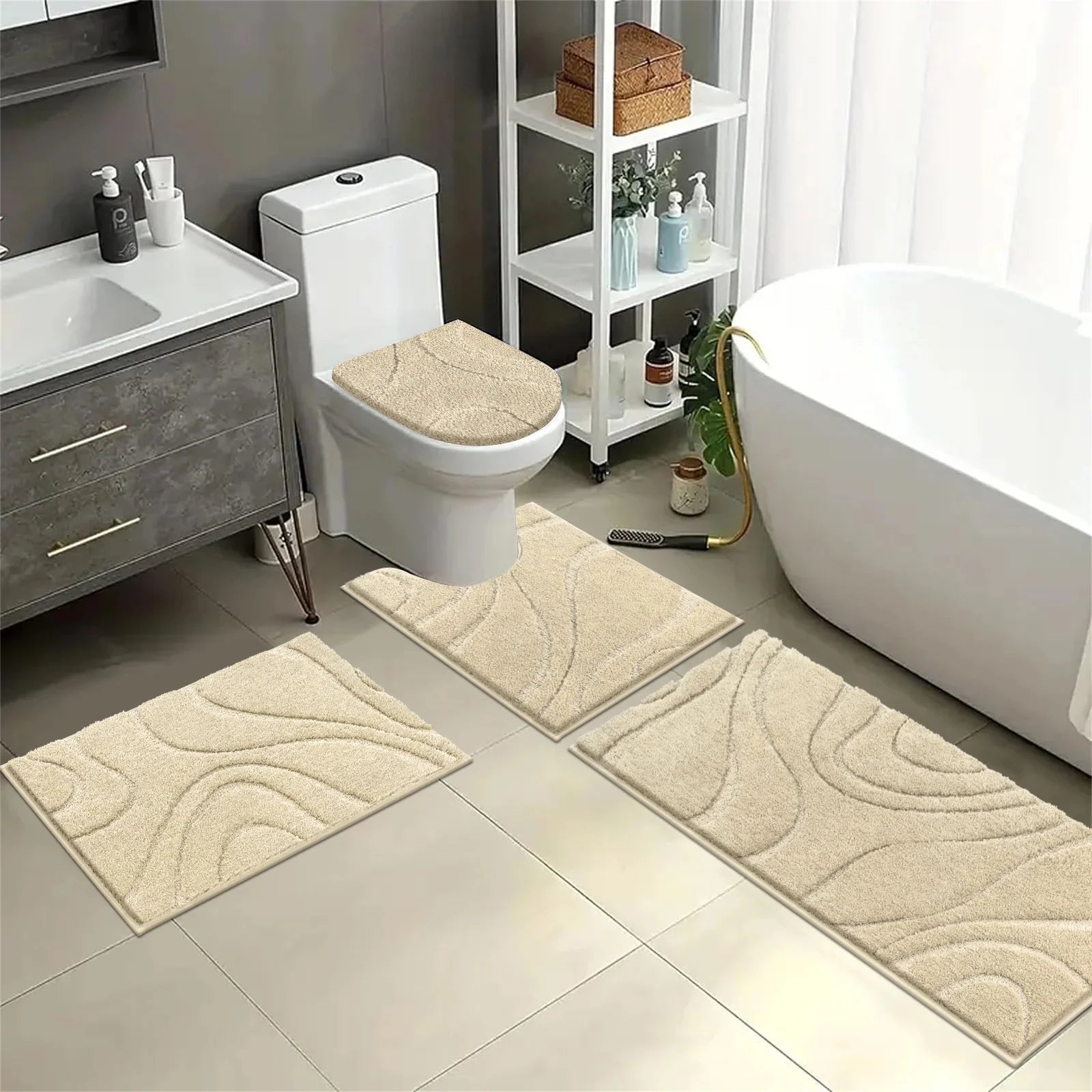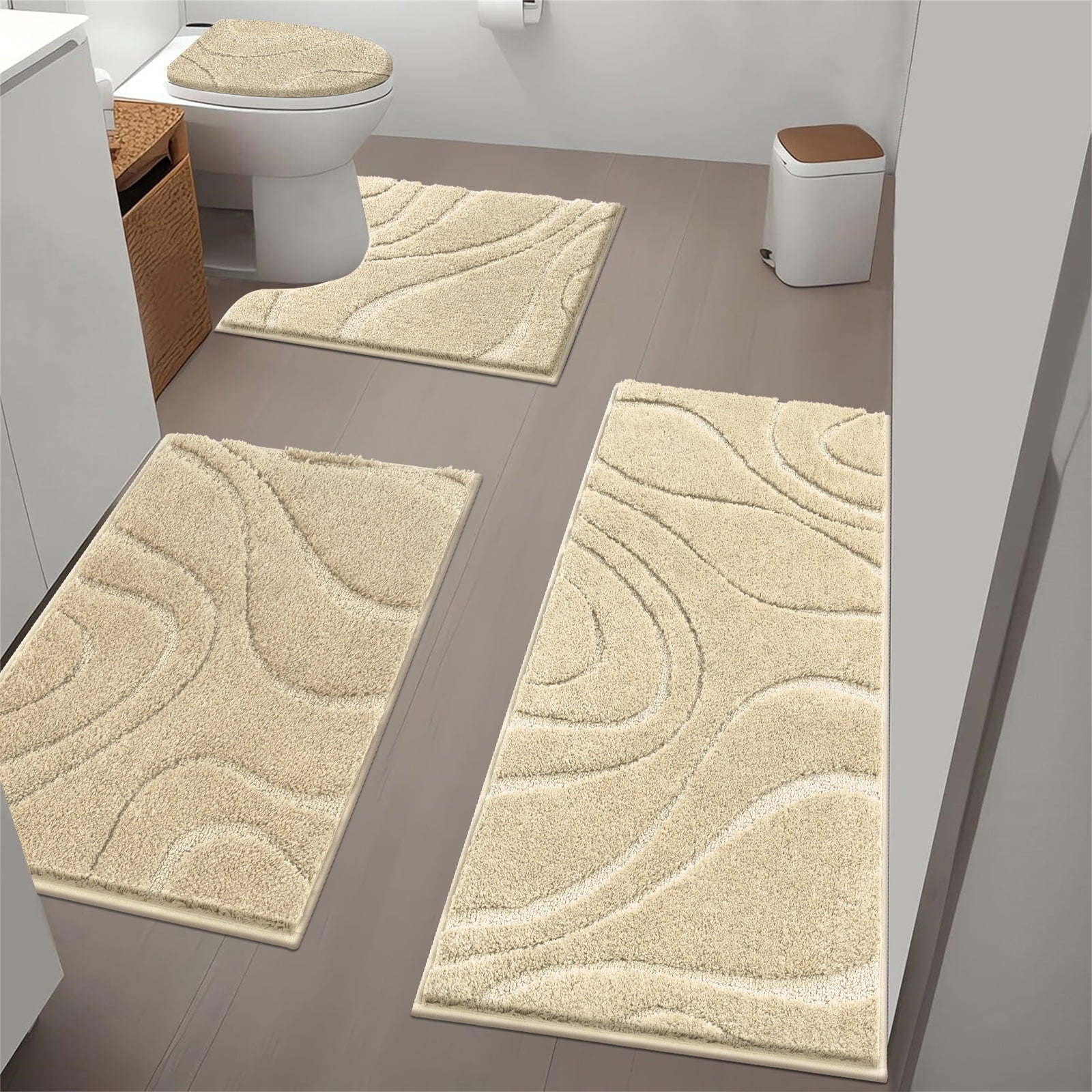 Microfiber Shaggy Bathroom Rug Set Made of high-quality microfiber, this non-slip bathroom mat is soft and thick, and feels like stepping into the clouds when you step on it. And super absorbent, it can quickly hydrate the bottom of your feet after you shower, and it can keep your floor dry and protect your floor. Perfect size:This non-slip bathroom floor mat four-piece set is 18"x26"+20"x48"+U20"x23"+Cover19"x21", it can be perfectly applied to your bathroom, the large size can protect your floor from damage.