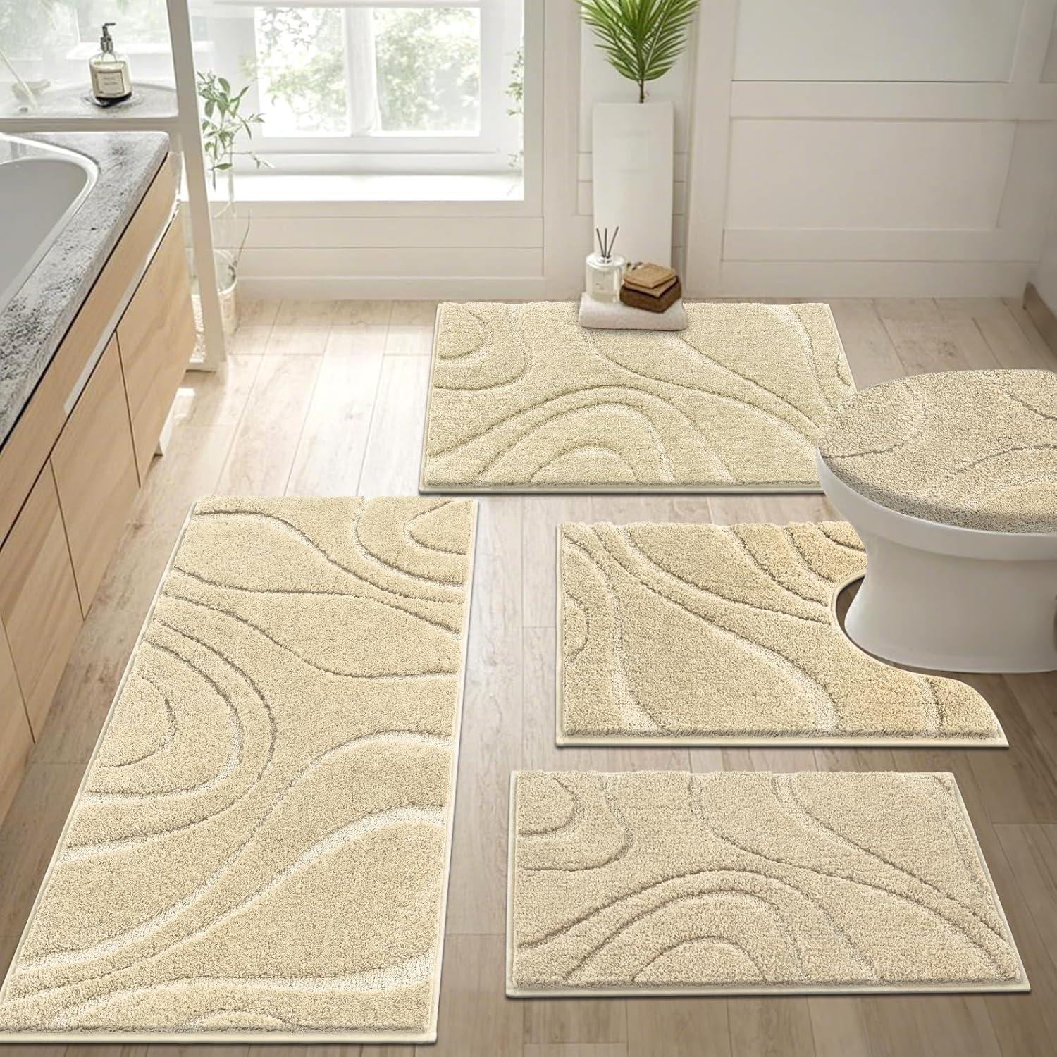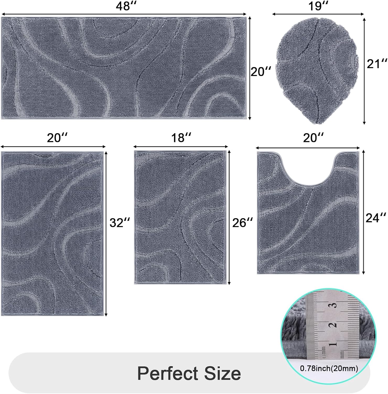 Ultra Soft Microfiber Bathroom Rugs: The bath mats for bathroom floor set of 5 are made up of 0.78'' thick, soft and fluffy microfiber, where with the help of unique fiber locking technique, the fluff is thicker, making it well-suited for bathroom, vanity, vacation home, master bedroom, kids’ bathroom, guest suite and provides a soft and comfortable experience for your feet as walking on clouds