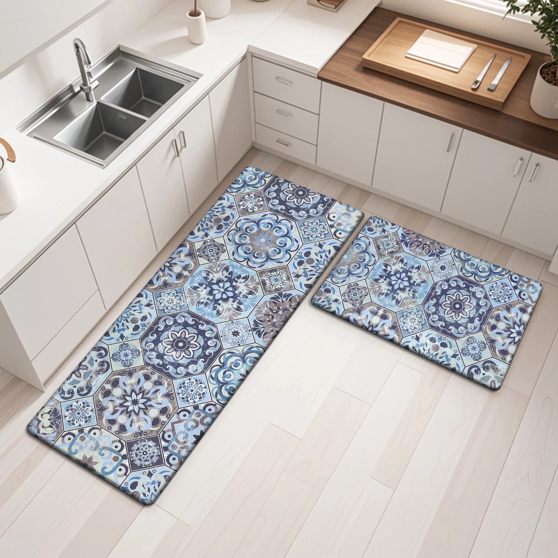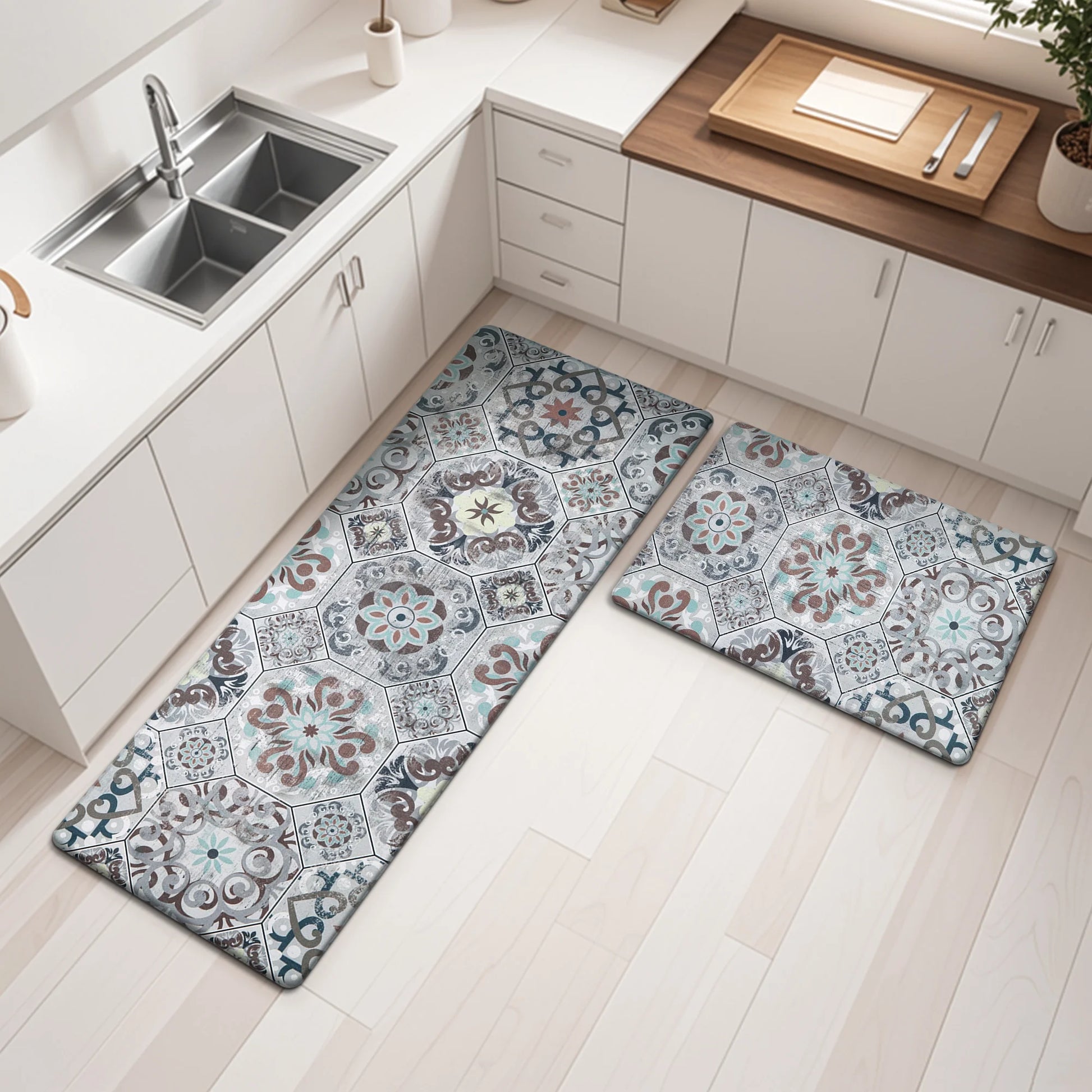HEBE Boho Kitchen Rug Set of 2, Non-Slip Anti-Fatigue Waterproof Cushioned Mat for Kitchen, Dining & Laundry Room, 18"x30"+18"x48"